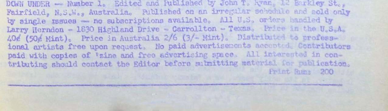 Down Under -- Number 1. Edited and Published by John T. Ryan, 12 Barkley St., Fairfield, N.S.W., Australia. Published on an irregular schedule and sold only by single issues -- no subscriptions available. All U.S. orders handled by Larry Horndon - 1830 Highland Drive - Carrollton - Texas. Price in the U.S.A. 40 c (50c Mint). Prince in Australia 2/6 (3/- Mint). Distributed to professional artists free upon request. No paid advertisements accepted. Contributors paid with copies of 'zine and free advertising space. All interested in contributing should contact the Editor before submitting material for publication. Print Runs 200.