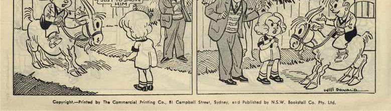This issue's creator is reported as Margaret Kinnear by Mick Stone in Bonzer and www.daao.org.au/bio/margaret-kinnear. Carol Mills estimates a 1940 publication date. Design & Art Australia Online reports "dated 1940 by Shiell and Mills (p.52), but Muir vol.1 (no.2056) gives it as 1917 (possibly a reprint?)" from www.daao.org.au/bio/will-donald/biography/, accessed 26 September 2017.