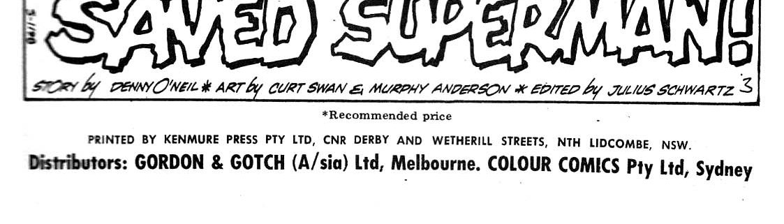 Printed by Kenmure Press Pty Ltd, Cnr Derby and Wetherill Streets, Nth Lidcombe, NSW, for the proprietors Colour Comics Pty Ltd, Sydney and produced by the K. G. Murray Publishing Company Pty Ltd, 142 Clarence Street, Sydney. Gordon & Gotch (A/sia) Ltd, distributors for Australia and New Zealand. Sequences in this issue Copyright National Periodical Publications Inc.