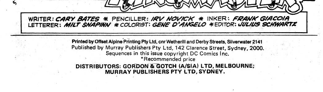 Printed by Offset Alpine Printing Pty Ltd, cnr Wetherill and Derby Streets, Silverwater 2141. Published by Murray Publishers Pty Ltd, 142 Clarence Street, Sydney, 2000. Sequences in this issue copyright DC Comics Inc. Distributors: Gordon & Gotch (A/sia) Ltd, Melbourne; Murray Publishers Pty Ltd, Sydney.