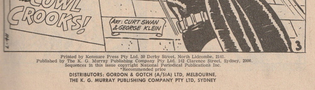 Printed by Kenmure Press Pty Ltd, 50 Derby Street, North Lidcombe, 2141. Published by The K. G. Murray Publishing Company Pty Ltd, 142 Clarence Street, Sydney, 2000. Sequences in this issue copyright National Periodical Publications Inc. Distributors: Gordon & Gotch (A/sia) Ltd, Melbourne, The K. G. Murray Publishing Company Pty Ltd, Sydney.