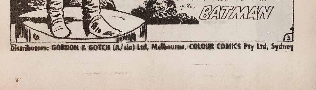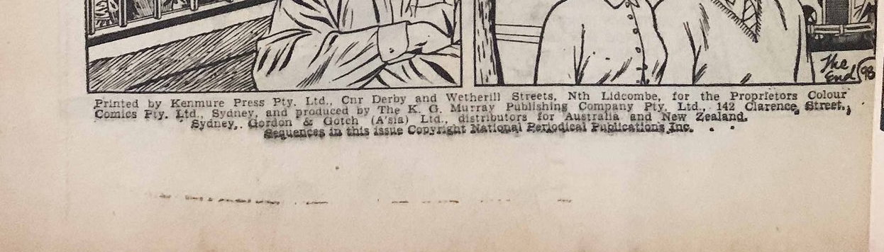 Printed by Kenmure Press Pty. Ltd., Cnr Derby and Wetherill Streets, Nth Lidcombe, for the Proprietors Colour Comics Pty. Ltd., Sydney, and produced by The K. G. Murray Publishing Company Pty. Ltd., 142 Clarence Street, Sydney. Gordon & Gotch (A'sia) Ltd., distributors for Australia and New Zealand. Sequences in this issue Copyright National Periodical Publications Inc.
