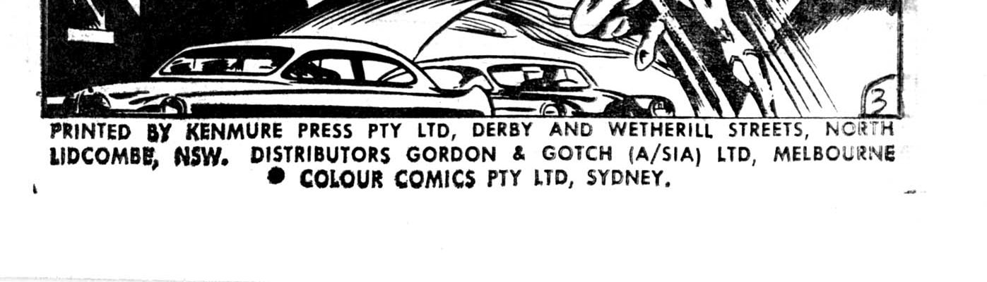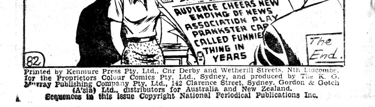 Printed by Kenmure Press Pty. Ltd., Cnr Derby and Wetherill Streets, Nth Lidcombe, for the proprietors Colour Comics Pty. Ltd., Sydney, and produced by The K. G. Murray Publishing Company Pty. Ltd., 142 Clarence Street, Sydney. Gordon & Gotch (A'sia) Ltd., distributors for Australia and New Zealand. Sequences in this issue copyright National Periodical Publications Inc.