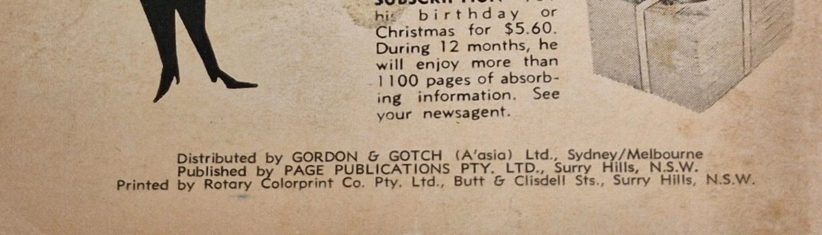 Distributed by Gordon & Gotch (A'asia) Ltd., Sydney/Melbourne. Published by Page Publications Pty. Ltd., Surry Hills, N.S.W. Printed by Rotary Colorprint Co. Pty. Ltd., Butt & Clisdell Sts., Surry Hills, N.S.W.