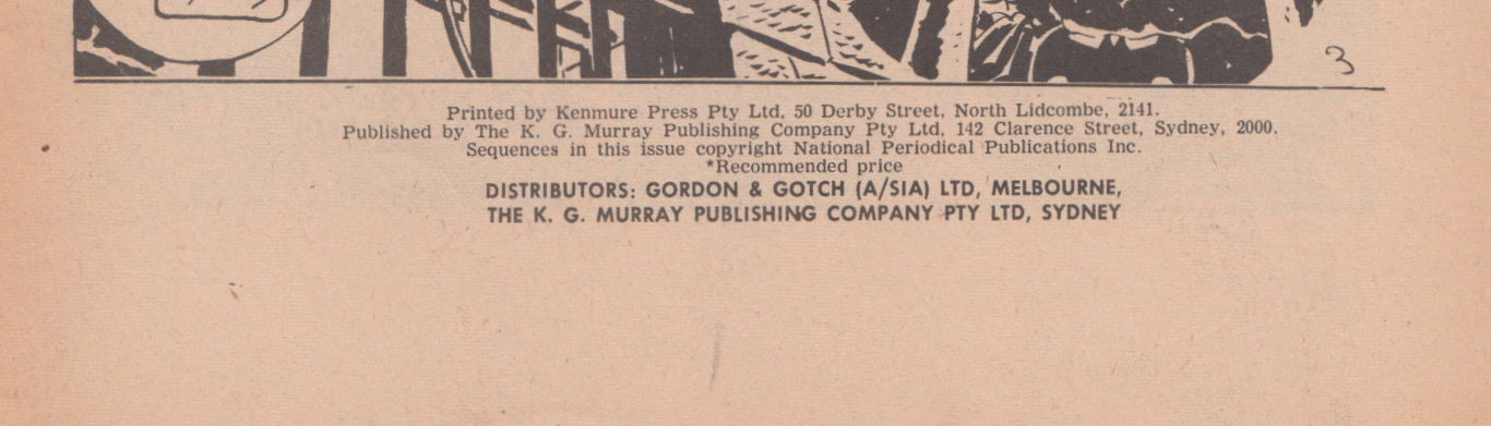 Printed by Kenmure Press Pty Ltd, 50 Derby Street, North Lidcombe, 2141. Published by The K. G. Murray Publishing Company Pty Ltd, 142 Clarence Street, Sydney, 2000. Sequences in this issue copyright National Periodical Publications Inc. Distributors: Gordon & Gothc (A/sia) Ltd, Melbourne, The K. G. Murray Publishing Company Pty Ltd, Sydney.