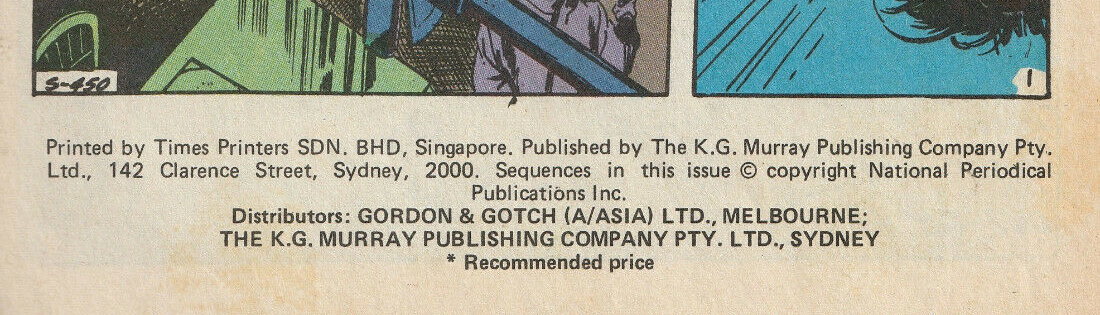 Printed by Times Printers SDN, BHD, Singapore. Published by The K.G. Murray Publishing Company Pty. Ltd., 142 Clarence street, Sydney, 2000. Sequences in this issue © copyright National Periodical Publications Inc. Distributors: Gordon & Gotch (A/asia) Ltd., Melbourne; The K.G. Murray Publishing Company Pty. Ltd., Sydney.