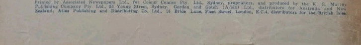 Printed by Associated Newspapers Ltd. for Colour Comics Pty. Ltd., Sydney, Proprietors, and Produced by the K. G. Murray Publishing Company Pty. Ltd., 56 Young Street, Sydney. Gordon and Gotch (A/sia) Ltd., distributors for Australia and New Zealand. Atlas Publishing and Distributing Co. Ltd., 18 Bride Lane, Fleet Street, London, E.C.4., distributors for the British Isles.