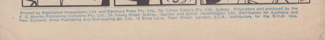 Printed by Associated Newspapers Ltd. And Kenmure Press Pty. Ltd., for Colour Comics Pty. Ltd., Sydney. Proprietors and produced by the K. G. Murray Publishing Company Pty. Ltd., 56 Young Street, Sydney. Gordon and Gotch (Australasia) Ltd. Distributors for Australia and New Zealand. Atlas Publishing and Distributing Co. Ltd., 18 Bride Lane, Fleet Street, London, E.C.4. distributors for the British Isles.