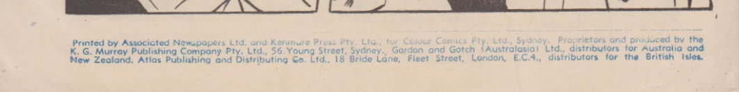 Printed by Associated Newspapers Ltd. and Kenmure Press Pty. Ltd., for Colour Comics Pty. Ltd., Sydney, Proprietors and produced by the K. G. Murray Publishing Company Pty. Ltd., 56 Young Street, Sydney. Gordon and Gotch (Australasia) Ltd., distributors for Australia and New Zealand. Atlas Publishing and Distributing Co. Ltd., 18 Bride Lane, Fleet Street, London, E.C.4., distributors for the British Isles.
