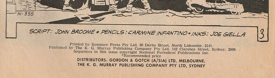 Printed by Kenmure Press Pty Ltd, 58 Derby Street, North Lidcombe, 2141. Published by The K. G. Murray Publishing Company Pty Ltd, 142 Clarence Street, Sydney, 2000. Sequences in this issue copyright National Periodical Publications Inc. Distributors: Gordon & Gotch (A/sia) Ltd, Melbourne, The K. G. Murray Publishing Company Pty Ltd, Sydney.