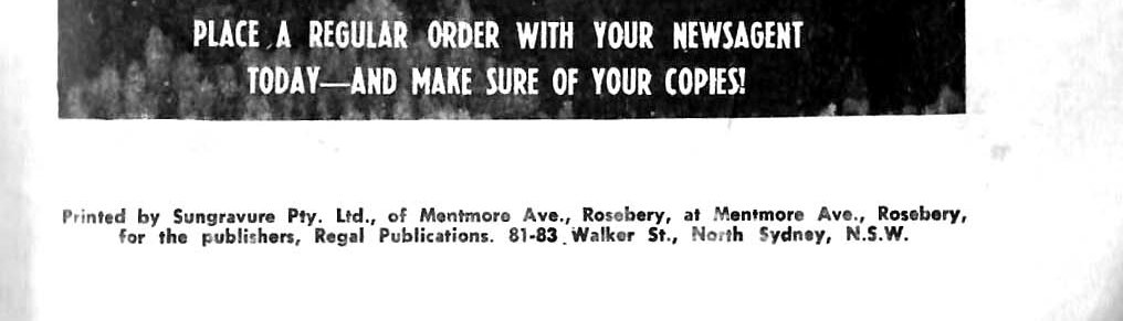 Printed by Sungravure Pty. Ltd., of Mentmore Ave., Rosebery, at Mentmore Ave., Rosebery, for the publishers, Regal Publications, 81-83 Walker St., North Sydney, N.S.W. Distributed by Gordon & Gotch (A/sia) Ltd., Melbourne. Printed by Sungravure Apty. Ltd., of Mentmore Ave., Rosebery, at Mentmore Ave., Rosebery.