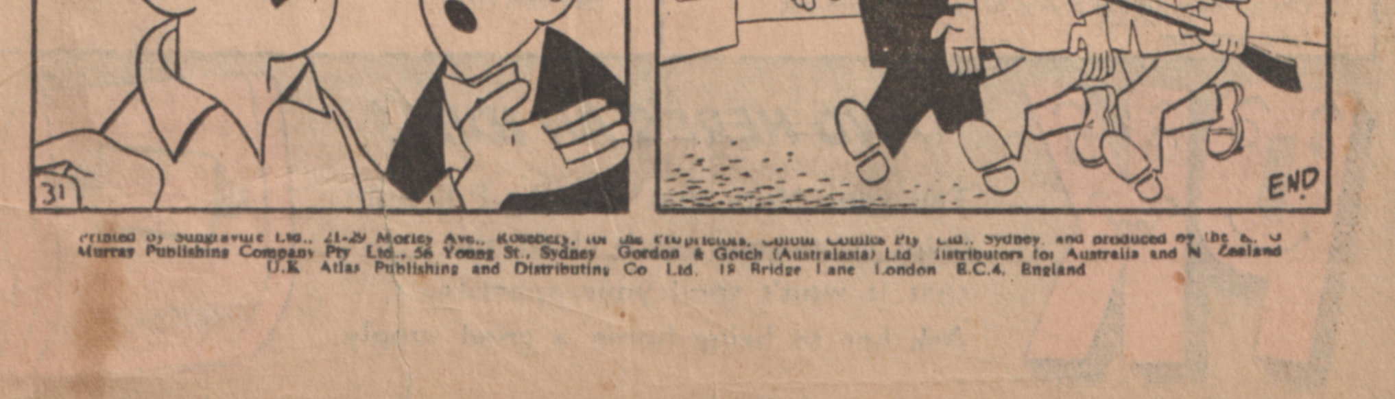 Printed by Sungravure Ltd.,, 21-29 Morley Ave., Rosebery, for the Proprietors, Colour Comics Pty. Ltd., Sydney, and produced by the K. G. Murray Publishing Company Pty. Ltd., 56 Young St., Sydney. Gordon & Gotch (Australasia) Ltd., distributors for Australia and N. Zealand. U.K. Atlas Publishing and distributing Co. Ltd., 18 Bridge Lane, London, B.C.4., England.