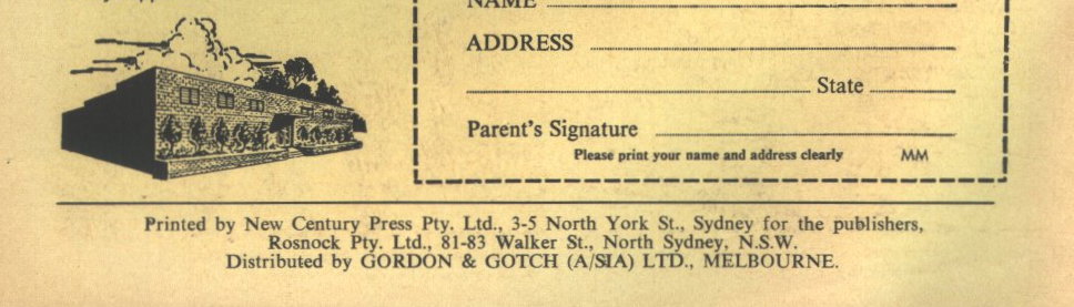 Printed by New Century Press Pty. Ltd., 3-5 North York St., Sydney for the publishers Rosnock Pty. Ltd., 81-83 Walker St., North Sydney, N.S.W. Distributed by Gordon & Gotch (A/sia) Ltd., Melbourne.
