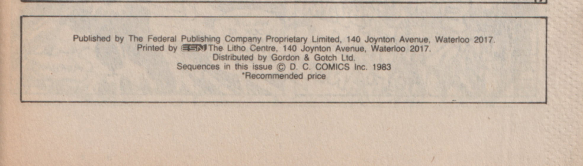 Published by The Federal Publishing Company Proprietary Limited, 140 Joynton Avenue, Waterloo 2017. Printed by ESN The Litho Centre, 140 Joynton Avenue, Waterloo 2017. Distributed by Gordon & Gotch Ltd. Sequences in this issue © D. C. Comics Inc. 1983.