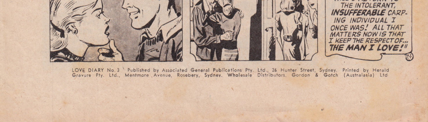 Love Diary No. 3. Published by Associated General Publications Pty. Ltd., 26 Hunter Street, Sydney. Printed by Herald Gravure Pty. Ltd., Mentmore Avenue, Rosebery, Sydney. Wholesale distributors, Gordon & Gotch (Australasia) Ltd.