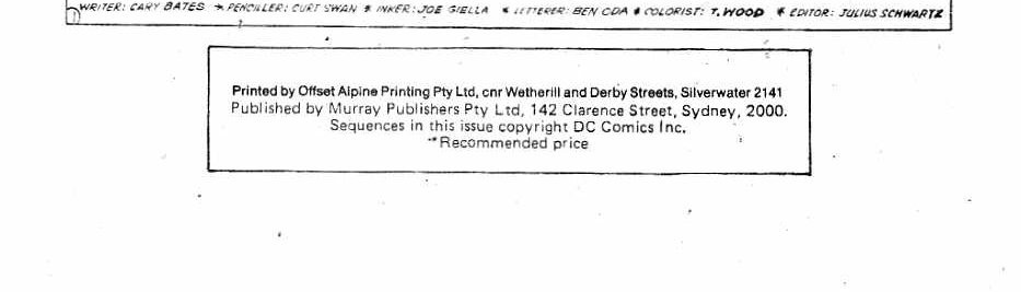 Printed by offset Alpine Printing Pty Ltd, cnr Wetherill and Derby Streets, Silverwater 2141. Published by Murray Publishers Pty Ltd, 142 Clarence Street, Sydney, 2000. Sequences in this issue copyright DC Comics Inc.