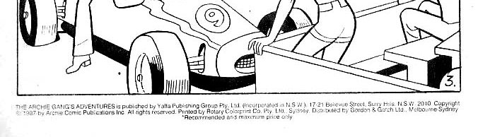 The Archie Gang's Adventures is published by Yaffa Publishing Group Pty. Ltd. (Incorporated in N.S.W.) 17-21 Bellevue Street, Surry Hills, N.S.W. 2010. Copyright © 1987 by Archie Comic Publications Inc. All rights reserved. Printed by Rotary Colorprint Co. Pty. Ltd., Sydney. Distributed by Gordon & Gotch Ltd., Melbourne-Sydney.