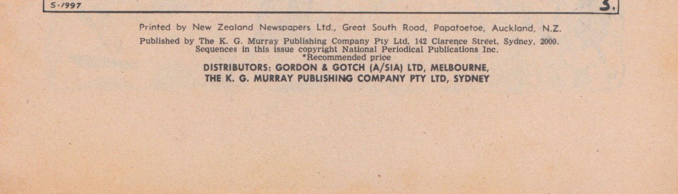 Printed by New Zealand Newspapers Ltd., Great South Road, Papatoetoe, Auckland, N.Z. Published by the K. G. Murray Publishing Company Pty Ltd, 142 Clrence Street, Sydney, 2000. Sequences in this issue copyright National Periodical Publications Inc. Distributors: Gordon & Gotch (A/sia) Ltd, Melbourne, The K. G. Murray Publishing Company Pty Ltd, Sydney.