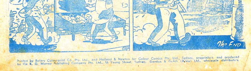 Printed by Rotary Colorprint Pty. Ltd. and Holland and Newton for Color Comics Pty. Ltd., Sydney, proprietors, and produced by the K. G. Murray Publishing Company Pty. Ltd., 56 young Street, Sydney. Gordon and Gotch (A/sia) Ltd., wholesale distributors.