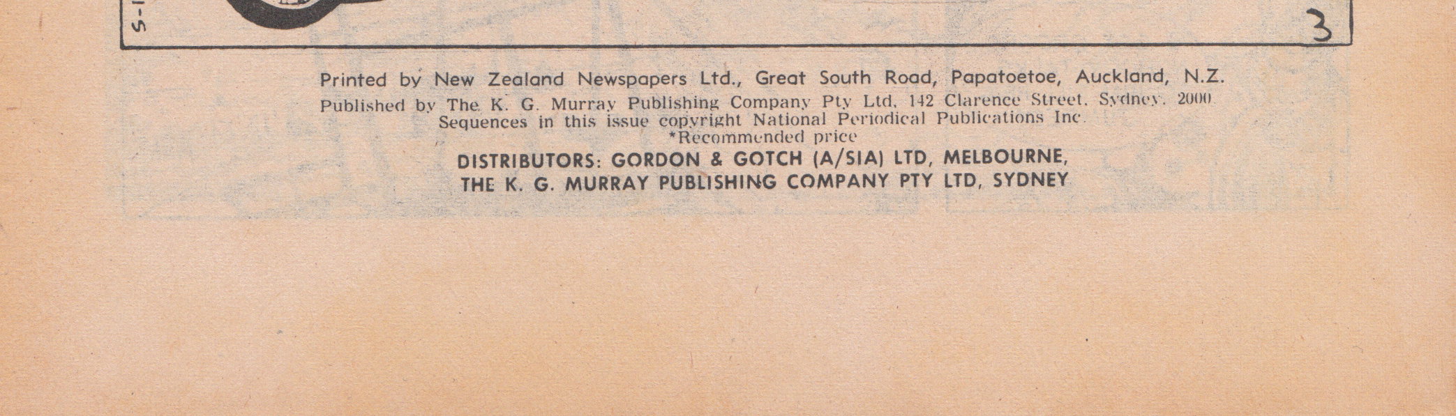 Printed by New Zealand Newspapers Ltd., Great South Road, Papatoetoe, Auckland, N.Z. Published by The K. G. Murray Publishing Company Pty Ltd, 142 Clarence Street, Sydney, 2000. Sequences in tis issue copyright National Periodical Publications. Distributors: Gordon & Gotch (A/sia) Ltd, Melbourne, The K. G. Murray Publishing Company Pty Ltd, Sydney.