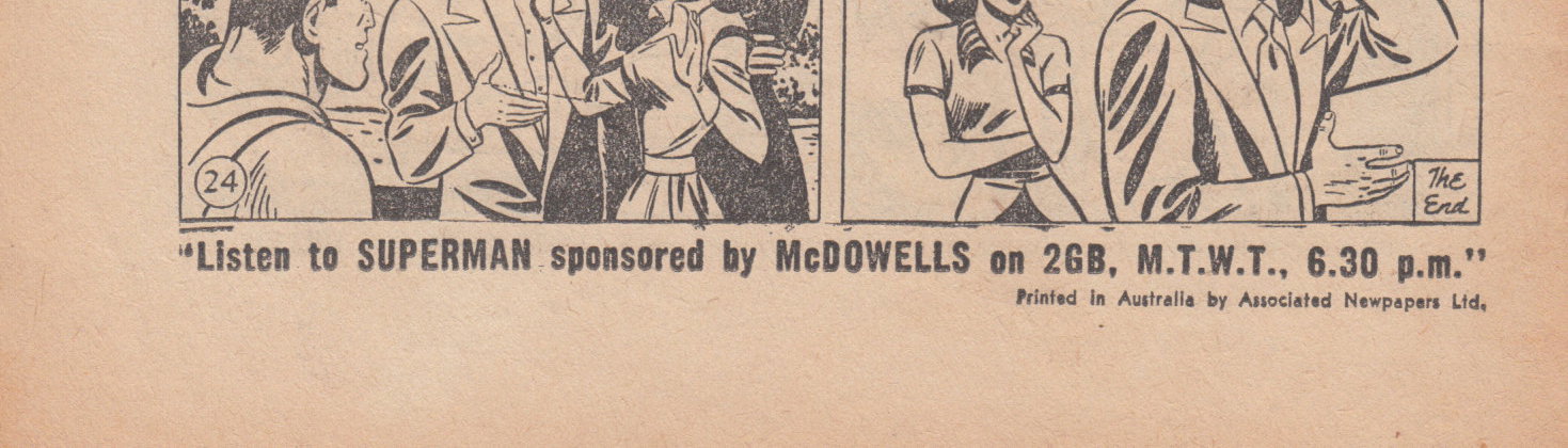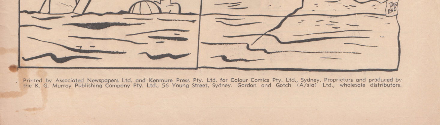 Printed by Associated Newspapers Ltd. and Kenmure Press Pty. Ltd. for Colour Comics Pty. Ltd., Sydney. Proprietors and produced by the K. G. Murray Publishing Company Pty. Ltd., 56 Young Street, Sydney. Gordon and Gotch (A/sia) Ltd., wholesale distributors.