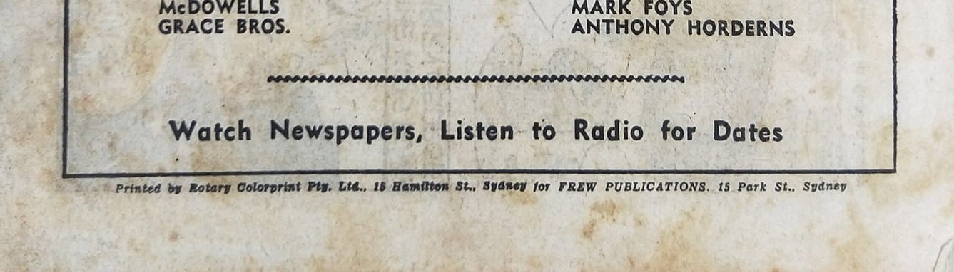 Printed by Rotary Colorprint Pty. Ltd., 15 Hamilton Street, Sydney for Frew Publications, 15 Park St., Sydney.
