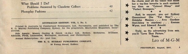 Printed in Australia by Cumberland Newspapers, Ltd., Parramatta, and published by The K. G. Murray Publishing Company, Sydney, for the proprieters, Macfadden Magazines, Incorporated. Sole Agents: Messrs. Gordon & Gotch (A/sia.) Ltd., Sydney, Melbourne, Brisbane, Adelaide, Perth, Launceston, Wellington, Auckland, and Christchurch. The K. G. Murray Publishing Company, 56 Young Street, Sydney.