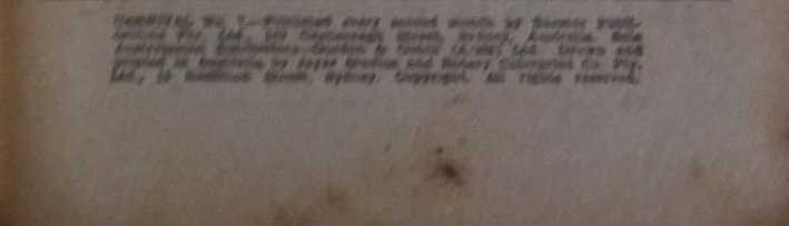 Carnival No. 7.--Published every second month by Barmor Publications Pty. Ltd., 149 Castlereagh Street, Sydney, Australia. Sole Australian distributors--Gordon & Gotch (A/sia) Ltd. Drawn and printed in Australia by Jayar Studios and Rotary Colorprint Co. Pty. Ltd., 15 Hamilton Street, Sydney. Copyright. All rights reserved.