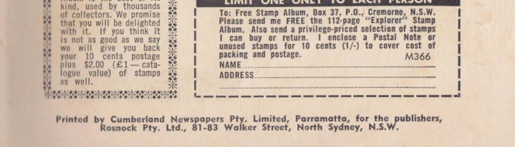 Printed by Cumberland Newspapers Pty. Limited, Parramatta, for the publishers, Rosnock Pty. Ltd., 81-83 Walker Street, North Sydney, N.S.W.