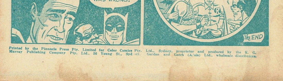 Printed by the Pinacle Press Pty. Limited for Color Comics Pty. Ltd., Sydney, Proprietor and produced by the K. G. Murray Publishing Company Pty. Ltd., 56 Young St., Sydney. Gordon and Gotch (A/sia) Ltd., wholesale distributors.