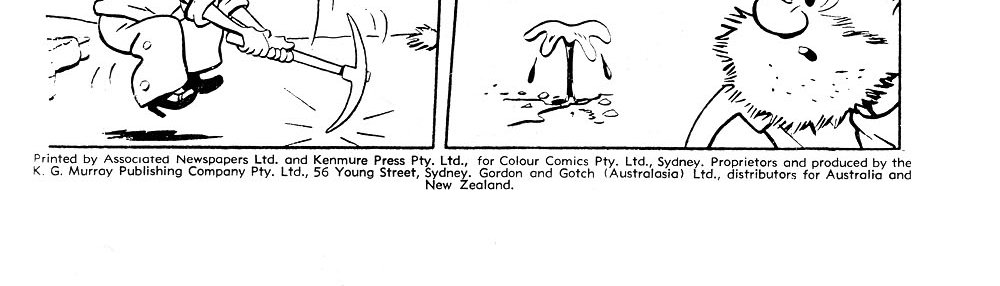 Printed by Associated Newspapers Ltd. and Kenmure Press Pty. Ltd., for Colour Comics Pty. Ltd., Sydney. Proprietors and produced by the K. G. Murray Publishing Company Pty. Ltd., 56 Young Street, Sydney. Gordon and Gotch (Australasia) Ltd., distributors for Australia and New Zealand.