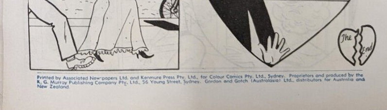 Printed by Associated Newspapers Ltd. And Kenmure Press Pty. Ltd., for Colour Comics Pty. Ltd., Sydney. Proprietors and produced by the K. G. Murray Publishing Company Pty. Ltd., 56 Young Street, Sydney. Gordon and Gotch (Australasia) Ltd., distributors for Australia and New Zealand.