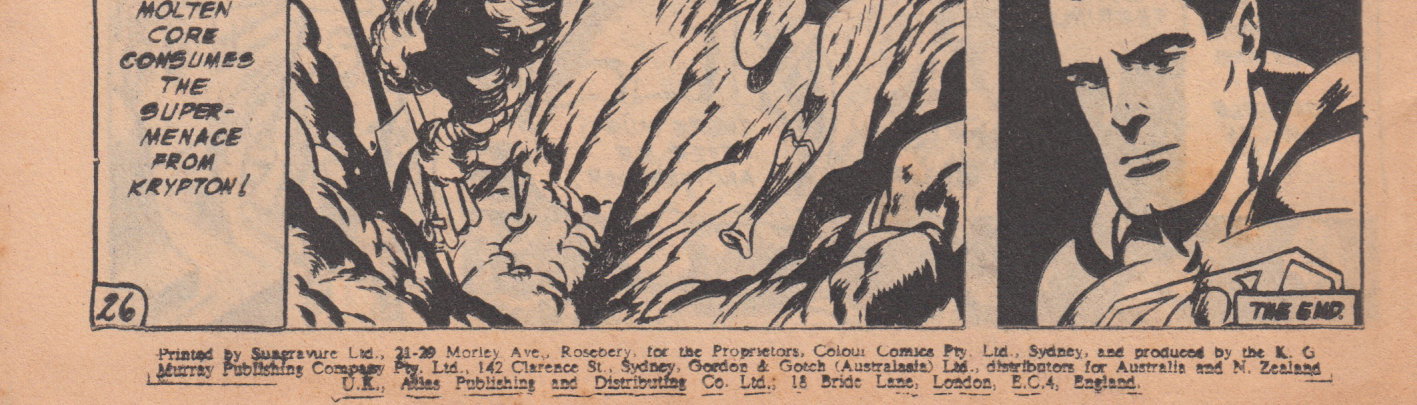 Printed by Sungravure Ltd., 21-29 Morley Ave., Rosebery, for the Proprietors Colour Comics Pty. Ltd., Sydney and Produced by the K. G. Murray Publishing Company Pty Ltd., 142 Clarence St., Sydney, Gordon & Gotch (Australasia) Ltd., distributors for Australia and N. Zealand. U.K.: Atlas Publishing and Distributing Co. Ltd., 18 Bride Lane, London, E.C.4. England.