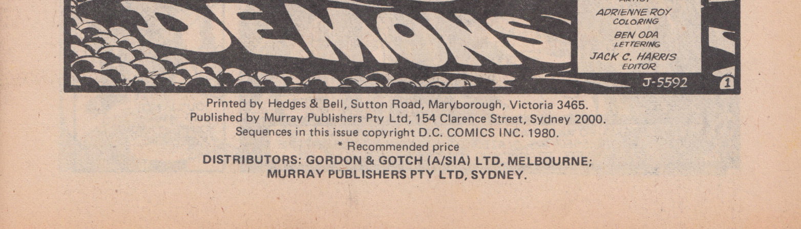 Printed by Hedges & Bell, Sutton Road, Maryborough, Victoria 3465. Published by Murray Publishers Pty Ltd, 154 Clarence Street, Sydney 2000. Sequences in this issue copyright D.C. Comics Inc. 1980. Distributors: Gordon & Gotch (A/sia) Ltd, Melbourne; Murray Publishers Pty Ltd, Sydney.
