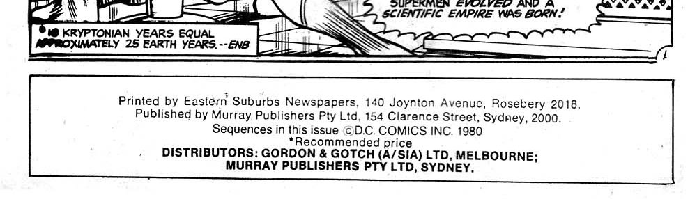 Printed by Eastern Suburbs Newspapers, 140 Joynton Avenue, Rosebery 2018. Published by Murray Publishers Pty Ltd, 154 Clarence Street, Sydney, 2000. Sequences in this issue © D.C. Comics Inc. 1980. Distributors: Gordon & Gotch (A/sia) Ltd, Melbourne; Murray Publishers Pty Ltd, Sydney.