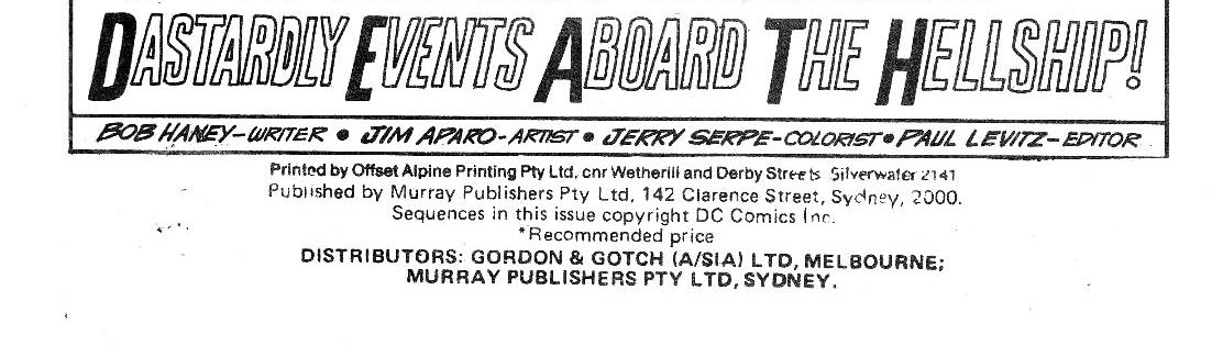 Printed by Offset Alpine Printing Pty Ltd, cnr Wetherill and Derby Streets, Silverwater 2141. Published by Murray Publishers Pty. Ltd., 142 Clarence Street, Sydney, 2000. Sequences in this issue copyright DC Comics Inc. Distributors: Gordon & Gotch (A/asia) Ltd., Melbourne; Murray Publishers Pty. Ltd., Sydney.