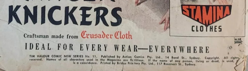 Tim Valour Comic New Series No. 11. Published by Action Comics Pty. Ltd., 14 Bond St., Sydney. Copyright. All rights reserved. Names of all characters used in the Magazine are fictitious. If the name of any person, living or dead, is used, it is a coincidence. Printed by Bridge Printery Pty. Ltd., 117 Reservoir St., Sydney.
