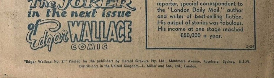 "Edgar Wallace No. 2." Printed for the publishers by Herald Gravure Pty. Ltd., mentmore Avenue, Rosebery, Sydney, N.S.W. Distributors in the United Kingdom--L. Miller and Son, Ltd., London.