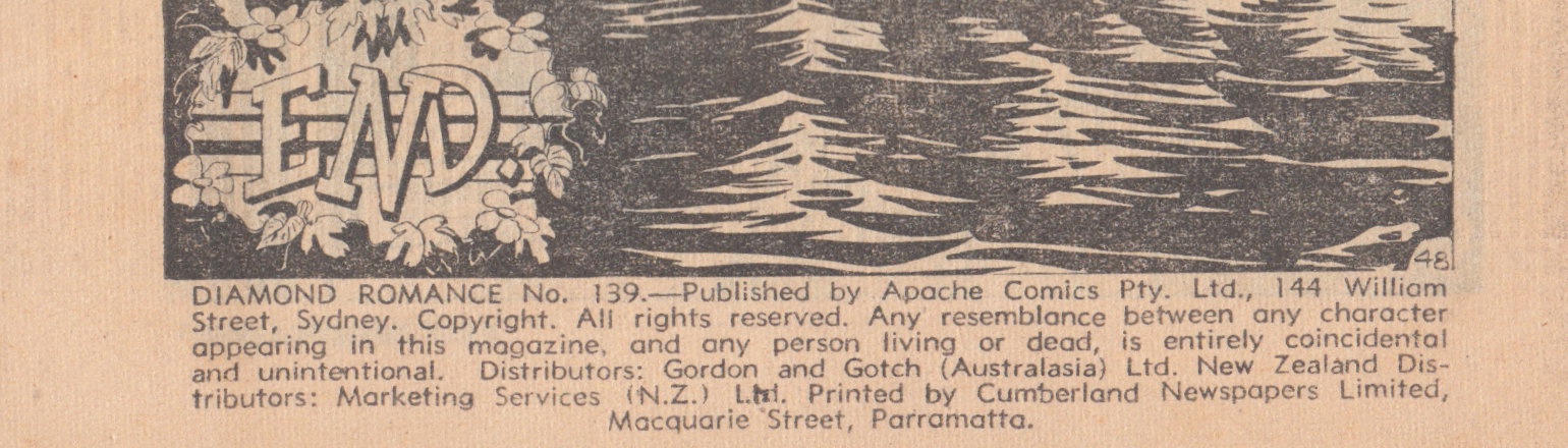 Diamond Romance No. 139.--Published by Apache Comics Pty. Ltd., 144 William Street, Sydney. Copyright. All rights reserved. Any resemblance between any character appearing in this magazine, and any person living or dead, is entirely coincidental and unintentional. Distributors: Gordon and Gotch (Australasia) Ltd. New Zealand Distributors: Marketing Services (N.Z.) Ltd. Printed by Cumberland Newspapers Limited, Macquarie Street, Parramatta.