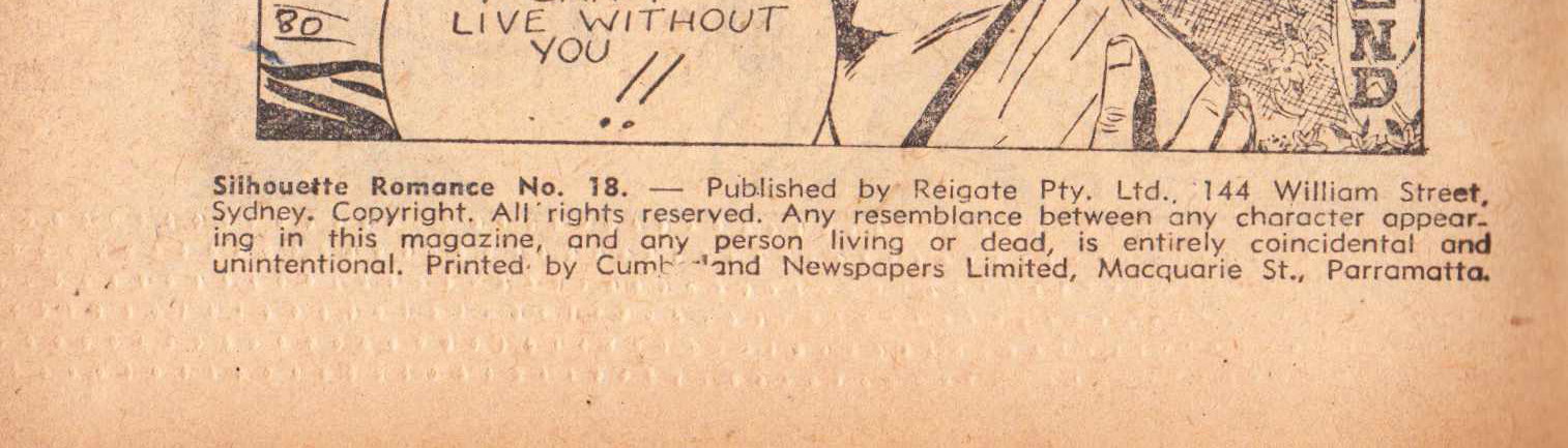 Silhouette Romance No. 18.--Published by Reigate Pty. Ltd., 144 William Street, Sydney. Copyright. All rights reserved. Any resemblance between any character appearing in this magazine, and any person living or dead, is entirely coincidental and unintentional. Printed by Cumberland Newspapers Limited, Macquarie St., Parramatta.