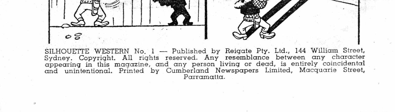 Silhouette Western No. 1--Published by Reigate Pty. Ltd., 144 William Street, Sydney. Copyright. All rights reserved. Any resemblance between any character appearing in this magazine, and any person living or dead, is entirely coincidental and unintentional. Printed by Cumberland Newspapers Limited, Macquarie Street, Parramatta.