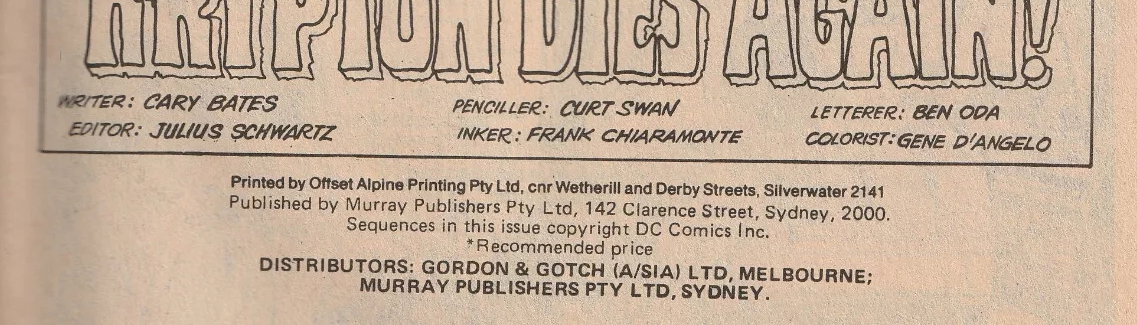 Printed by Offset Alpine Printing Pty Ltd, cnr Wetherill and Derby Streets, Silverwater 2141. Published by Murray Publishers Pty Ltd, 142 Clarence Street, Sydney, 2000. Sequences in this issue copyright DC Comics Inc. Distributors: Gordon & Gotch (A/sia) Ltd, Melbourne; Murray Publishers Pty Ltd, Sydney.