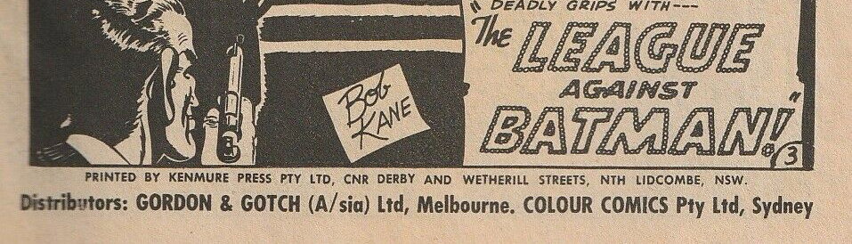 Printed by Kenmure Press Pty Ltd, cnr Derby and Wetherill Streets Nth Lidcombe, NSW, for the Proprietors Colour Comics Pty Ltd, Sydney, and produced by The K. G. Murray Publishing Company Pty Ltd, 142 Clarence Street, Sydney. Gordon & Gotch (A/sia) Ltd, distributors for Australia and New Zealand. Sequences in this issue Copyright National Periodical Publications Inc.
