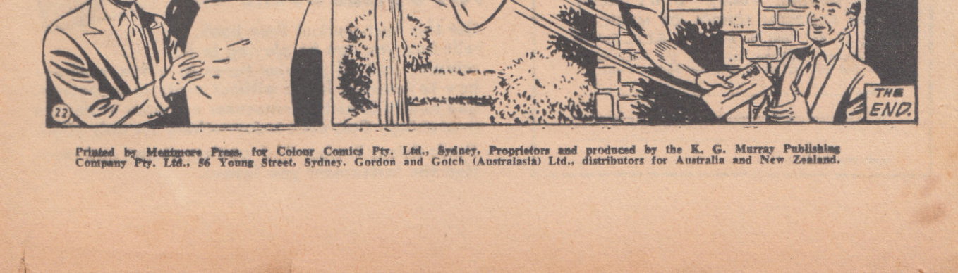 Printed by Mentmore Press, for Colour Comics Pty. Ltd., Sydney, Priprietors and produced by the K. G. Murray Publising Company Pty. Ltd., 56 Young Street, Sydney. Gordon and Gotch (Australasia) Ltd., distributors for Australia and New Zealand.