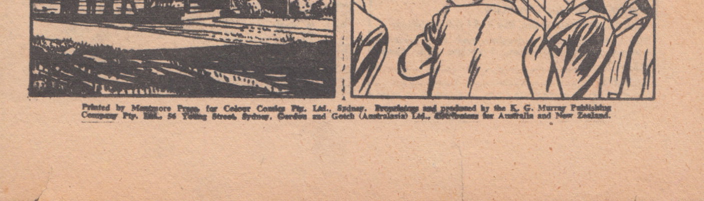 Printed by Mentmore Press for Colour Comics Pty. Ltd., Sydney. Proprietors and produced by the K. G. Murray Publishing Company Pty. Ltd., 56 Young Street, Sydney. Gordon and Gotch (Australasia) Ltd., distributors for Australia and New Zealand.