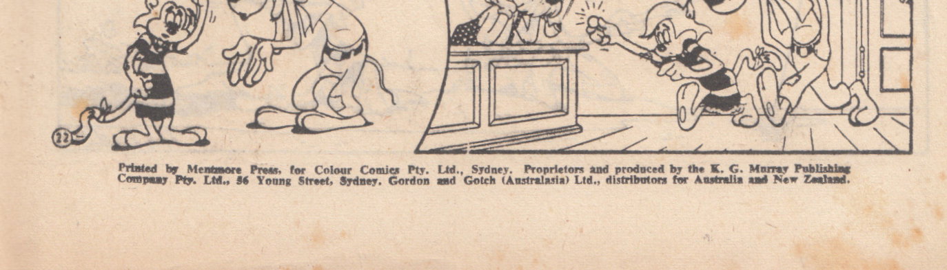 Printed by Mentmore Press, for Colour comics Pty. Ltd., Sydney. Proprietors and produced by the K.G. Murray Publishing Company Pty. Ltd., 56 Young Street, sSydney. Gordon and Gotch (Australasia) Lte., distributed for Australia and New Zealand.