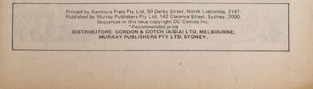 Printed by Kenmure Press Pty Ltd, 50 Derby Street, North Lidcombe, 2141. Published by Murray Publishers Pty Ltd, 142 Clarence Street, Sydney, 2000. Sequences in this issue copyright DC Comics Inc. Distributors: Gordon & Gotch (A/sia) Ltd, Melbourne; Murray Publishers Pty Ltd, Sydney.