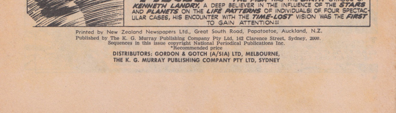 Printed by New Zealand Newspapers Ltd., Great South Road, Papatoetoe, Auckland, N.Z. Published by The K. G. Murray Publishing Company Pty Ltd, 142 Clarence Street, Sydney, 2000. Sequences in this issue copyright National Periodical Publications Inc. Distributors: Gordon & Gotch (A/sia) Ltd, Melbourne, The K. G. Murray Publishing Company Pty Ltd, Sydney.