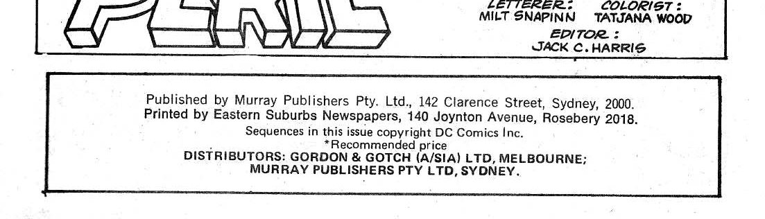 Published by Murray Publishers Pty. Ltd., 142 Clarence Street, Sydney, 2000. Printed by Eastern Suburbs Newspapers, 140 Joynton Avenue, Rosebery 2018. Sequences in this issue copyright DC Comics Inc. Distributors: Gordon & Gotch A/sia) Ltd, Melbourne; Murray Publishers Pty Ltd, Sydney.