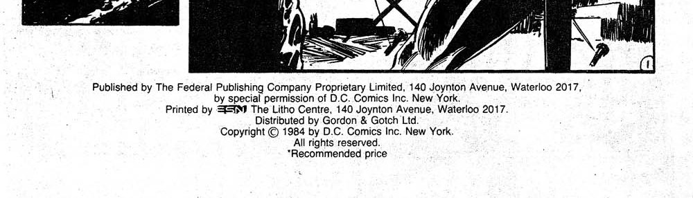 Published by The Federal Publishing Company Proprietary Limited, 140 Joynton Avenue, Waterloo 2017, by special permission of D.C. Comics Inc. New york. Printed by ESN The Litho centre, 140 Joynton Avenue, Waterloo 2017. distributed by Gordon & Gotch Ltd. Copyright © 1984 by D.C. Comics Inc. New York. All rights reserved.